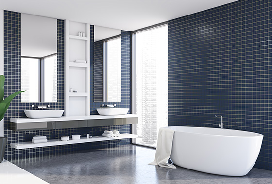 Frisco TX Homes for Sale Corner of luxury bathroom with blue tile walls, concrete floor, comfortable white bathtub and double sink with mirrors. 3d rendering